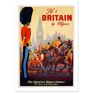 This captivating vintage travel poster from Pan American World Airways promotes flying to Britain in classic style. The illustration features a British royal guard in traditional red uniform and tall black hat, with the iconic Big Ben clock tower in the background. A procession of regal horse-drawn carriages and soldiers adds to the scene’s grandeur, evoking Britain’s rich royal heritage. The bold "Fly to Britain by Clipper" text at the top highlights the luxury and ease of travel with Pan Am, while the tagline “The System of the Flying Clippers” reinforces the airline’s prestige in air travel.