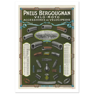 This detailed Pneus Bergougnan poster showcases a range of high-quality velocipede and motorcycle accessories, with a special focus on tires. The poster is visually rich, displaying various tire types, rubber components, and essential accessories such as valves, nozzles, and lubricants. An image of the Bergougnan factory in the center emphasizes the company’s craftsmanship and manufacturing excellence. The catalog also highlights product dimensions and specifications for different types of bicycles and motorcycles. With bold fonts and vibrant colors, this vintage advertisement captures the era’s industrial design while promoting Bergougnan’s commitment to superior quality and innovation in cycling and motorcycling accessories.