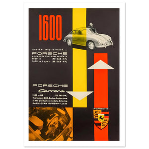 Mid-century Porsche advertisement highlighting new 1600 and Carrera models, with bold yellow and red arrows symbolising rising performance. A graceful 356 coupe, detailed engine close-up and proud crest anchor the layout, while concise text promotes horsepower, racing-derived technology and another step forward in Turismo motoring.