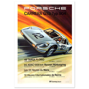 Dynamic vintage Porsche poster showcasing the silver Carrera GTS Typ 904 in action, celebrating its successes at Targa Florio, Nürburgring 1000 km, Le Mans and Reims endurance races through text.