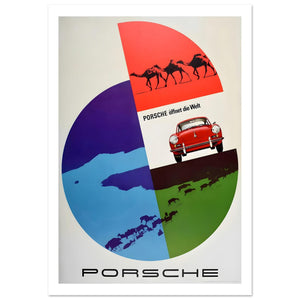 Stylish mid-century Porsche poster with a red 356 set within a segmented globe of deserts, seas and plains with animals, under the slogan “Porsche öffnet die Welt” – Porsche opens the world.