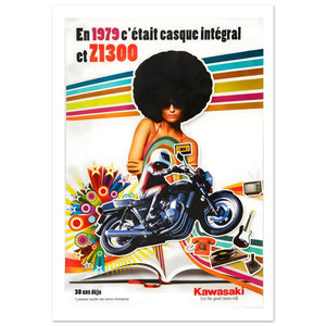 This vibrant, retro-themed poster celebrates the 30th anniversary of the Kawasaki Z1300, leaning heavily into 1970s nostalgia. The French headline, "En 1979 c’était casque intégral et Z1300," translates to "In 1979 it was full-face helmets and the Z1300."
