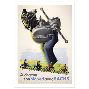 This captivating poster features an oversized illustration of a Sachs moped engine, held in a bold, blue hand, symbolizing power and precision. The engine is prominently displayed with the Sachs logo clearly visible, emphasizing its high-quality craftsmanship. Below, a trio of cyclists can be seen riding mopeds powered by Sachs engines, traversing a scenic countryside. The French slogan "A chacun son Moped avec SACHS" translates to "Everyone has their own moped with Sachs," highlighting the brand’s versatility and appeal to a wide range of riders. The bright, retro colors and strong design create a lasting impact.