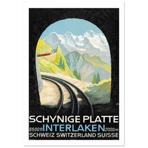 This poster captures the breathtaking view from the Schynige Platte railway route, nestled in the Swiss Alps. The image shows a vibrant, sunlit scene as the train emerges from a tunnel, offering a panoramic view of snow-capped peaks, lush green valleys, and winding tracks. With the text emphasizing the elevation (6500 ft/2000m), the poster invites travelers to experience the stunning vistas of Interlaken, Switzerland, highlighting the beauty of Swiss rail travel amidst the alpine landscape.