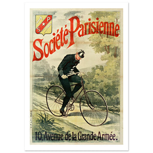 This classic Société Parisienne Cycles poster highlights a determined cyclist in motion, representing strength and precision. The man, dressed in a sleek black uniform and a matching cap, leans forward as he rides his vintage bicycle through a serene countryside path, showcasing the cycling brand’s commitment to performance and reliability. The bold, red typography of "Société Parisienne" stands out against the soft green and earthy background, drawing attention to the company’s Parisian roots. The bicycle's classic design and the cyclist’s focused posture evoke the early days of cycling as a sport, with an emphasis on endurance and quality.