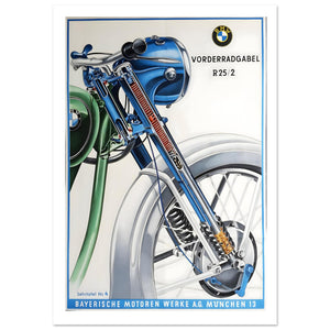 Discover the mechanical sophistication of German engineering with this vintage BMW R25/2 "Vorderradgabel" (front wheel fork) technical diagram. This educational "Lehrtafel Nr. 4" features a precise, color-coded cross-section revealing the internal springs and damping mechanics of the front suspension. Accented by the iconic BMW roundel and classic blue-and-white branding, this instructional piece is perfect for mechanics, restorers, or enthusiasts of historic Bayerische Motoren Werke machinery. It captures functional beauty through detailed technical artistry.