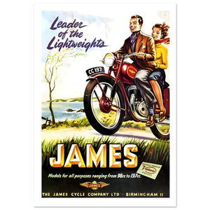 This vibrant vintage advertisement celebrates The James Cycle Company of Birmingham, positioning its motorcycles as the "Leader of the Lightweights". The illustration features a smiling couple riding a red motorcycle along a scenic coastline, evoking a sense of leisure and post-war optimism. The bike is powered exclusively by Villiers Engines, with models ranging from 98cc to 197cc to suit various purposes. The bold, 3D-style typography of the "JAMES" logo and the picturesque background emphasize a lifestyle of freedom and accessibility, characteristic of mid-century British motorcycle marketing.