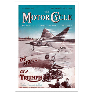 This vintage Triumph motorcycle advertisement features a playful illustration where a motorcyclist effortlessly rides while a jet plane takes off in the background. The text "It's easy on a Triumph" emphasizes the motorcycle's ease of use, comparing it to the power and speed of the jet. The scene, with the motorcyclist calmly maneuvering while the plane takes flight, highlights Triumph's superior performance and reliability. The tagline "The Best Motorcycle in the World" reinforces the brand’s iconic status. The vibrant and dynamic design, with its retro colors and action-packed composition, captures the thrill and precision of riding a Triumph.