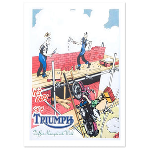 This playful vintage Triumph motorcycle poster features an amusing illustration of two bricklayers working on a construction site. One of the workers is comically riding a Triumph motorcycle, hanging upside down as it zooms past, effortlessly dodging bricks and construction debris. The text "It's easy on a Triumph" highlights the bike's effortless handling, while the phrase "The Best Motorcycle in the World" solidifies the brand’s reputation for quality and performance. The design, with its bright colors and humorous scene, promotes Triumph’s superior riding experience with a touch of fun and lightheartedness.