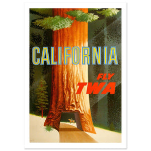 This vibrant mid-century poster from Trans World Airlines (TWA) highlights California’s natural beauty, featuring a striking image of a giant sequoia tree with a tunnel carved through its trunk. The scene evokes the majesty of California’s iconic national parks. The bold “CALIFORNIA” text stands out against the tree’s vibrant colors, while the “FLY TWA” tagline emphasizes the ease and comfort of flying with TWA to this stunning destination. The illustration’s dynamic use of color and perspective invites travelers to experience the grandeur of California’s landscapes, particularly its towering trees and picturesque surroundings.