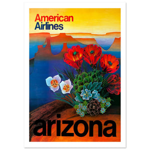 This striking vintage travel poster for American Airlines highlights the natural splendor of Arizona through a rich, artistic composition. The foreground is dominated by a detailed cluster of desert flora, including vibrant red cactus blooms, delicate white lilies, and textured succulents. These botanical elements are set against a dramatic, multi-hued backdrop of the Grand Canyon’s iconic mesas and plateaus, rendered in deep blues, oranges, and purples. With its bold, modern typography and warm sunset gradients, the artwork beautifully captures the rugged yet colorful allure of the American Southwest, inviting travelers to explore its unique landscape.