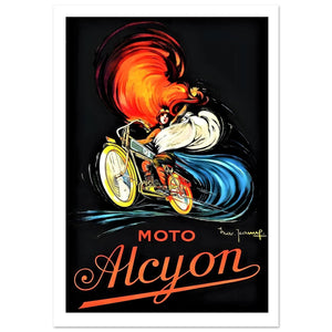 This striking poster for Moto Alcyon captures a sense of speed and motion with its dynamic artwork. A rider, dressed in orange and white, zooms across the scene, with her flowing hair and outfit creating swirling trails of red and white behind her, symbolizing the rush of wind. The bold yellow bike contrasts with the fiery red and cool blue streams, emphasizing the bike’s agility and power. The "MOTO Alcyon" text in bold orange adds a vintage flair, while the signature of the artist "Thar. Jeanner" at the bottom adds an authentic touch. This energetic design is a nod to classic motorbike culture.