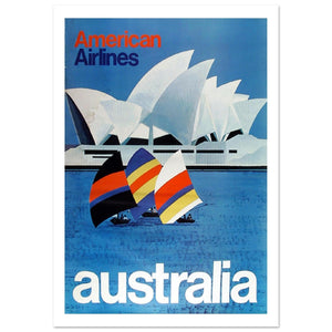 This striking vintage travel poster for American Airlines promotes tourism to Australia with a bold, graphic composition. The artwork features the iconic white sails of the Sydney Opera House gleaming against a deep blue sky. In the foreground, three sailboats with vibrant, multi-colored sails glide across the harbor, adding a sense of movement and leisure to the scene. The minimalist design utilizes large blocks of color and clean white typography at the bottom to create a modern, high-impact invitation to explore the continent's most famous coastal landmark by air.