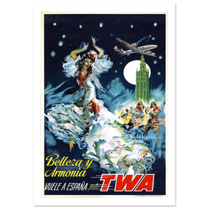 This enchanting vintage travel poster from TWA invites travelers to experience the "Beauty and Harmony" of Spain. The dramatic nighttime scene features a spirited flamenco dancer in a voluminous white ruffled dress, performing under a starlit sky. In the background, a full moon illuminates a towering Gothic cathedral and a group of traditional musicians. A sleek TWA Constellation aircraft soars above, linking modern aviation with Spain’s rich cultural heritage. The bold yellow and red typography creates a striking contrast against the deep blue night, perfectly capturing the romantic allure of a Spanish holiday.