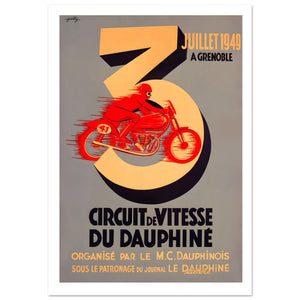 Celebrate mid-century French motorsport with this striking vintage poster for the July 1949 Circuit de Vitesse du Dauphiné in Grenoble. The bold graphic design features a large, stylized number three with a vibrant red motorcycle racer speeding through its center, capturing the essence of rapid motion. Organized by M.C. Dauphinois, this artwork reflects the postwar racing era's energy in a sophisticated palette of grey and red. It’s an essential piece for collectors of classic European memorabilia.