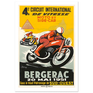 Relive the high-octane energy of French motorsport with this vibrant vintage racing poster for the 4e Circuit International de Vitesse. Held on 20 Mai 1951, the event featured thrilling moto et side-car competitions in Bergerac. The dynamic artwork showcases a racer in bright red leathers leaning into a sharp turn, followed closely by a yellow sidecar competitor. Set against a bold yellow background, this historic print captures the speed and prestige of mid-century racing culture.
