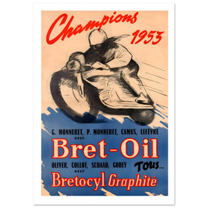 Celebrate the power and speed of postwar French motorsport with this striking 1953 Bret-Oil promotional poster. The dynamic illustration features a streamlined racer tucked low for maximum velocity, rendered in a bold, sketched style that conveys intense motion. Highlighting champions like Monneret and Camus, the design promotes Bretocyl Graphite against a patriotic red, white, and blue palette. This authentic period piece is a must-have for collectors of vintage oil advertisements and motorcycle racing history.
