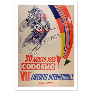 Relive the golden age of Italian racing with this vibrant 1953 Codogno International Circuit poster. Featuring the seventh edition of this historic race, the artwork captures two daring motorcyclists, numbers 13 and 40, leaning aggressively through a high-speed curve. A dynamic, multi-colored arrow representing international competitors sweeps across the frame, highlighting the 250cc and 500cc classes. This vintage-style print is a perfect and essential decorative piece for any classic motorcycle enthusiast or dedicated racing memorabilia collector seeking authentic Italian charm.