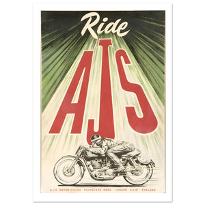 Celebrate a titan of British engineering with this striking vintage AJS motorcycle poster. The dynamic artwork features a sleek, monochromatic illustration of a racer tucked for speed against a dramatic, radiating green background. Dominating the top half is the iconic AJS logo in bold red, inviting enthusiasts to "Ride AJS". This classic promotional print from Plumstead Road, London, captures the timeless prestige and performance of historic British racing machinery, making it a perfect statement piece for collectors.