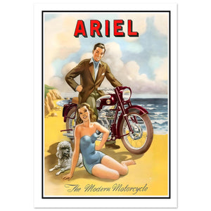 Embrace the carefree elegance of mid-century coastal life with this vintage Ariel advertisement poster. Titled "The Modern Motorcycle," the vibrant artwork features a sophisticated couple enjoying a sunny day at the shore beside a deep burgundy classic motorbike. A woman in a blue swimsuit poses on the sand with her poodle, while a gentleman stands proudly by the machine. This nostalgic print perfectly captures the 1950s lifestyle, making it a timeless decor piece for British motorcycle enthusiasts.