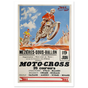 This dynamic vintage poster advertises a Moto-Cross event in Mézières-sous-Ballon, France, held on June 19. The vibrant illustration captures a lead racer in a red jersey soaring through the air on a BSA motorcycle, while another competitor in yellow follows closely behind. Spectators and flags, including the Union Jack, line the background cliffs, emphasizing an international competition featuring 35 riders from England, Belgium, and France. Organized by the "Moto-Club du Maine," the poster features bold BSA branding and typography, perfectly encapsulating the high-flying energy and excitement of mid-century off-road motorcycle racing.