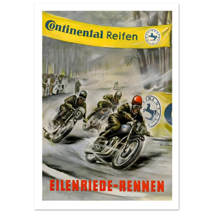 Relive the adrenaline of the track with this Vintage Continental Reifen Motorcycle Racing Poster. Depicting the legendary Eilenriede-Rennen, the artwork captures three racers in a high-speed lean through a misty curve. The vibrant yellow Continental banner and iconic horse logo highlight the brand's storied history in motorsport performance. With its dynamic brushwork and retro aesthetic, this piece serves as a stunning tribute to classic motorcycle culture. Perfect for any automotive enthusiast looking to add authentic vintage energy to their decor.