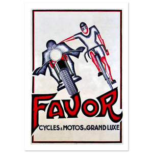 This striking art-deco-inspired poster showcases a bold visual of a motorcyclist and a cyclist in dynamic motion. The motorcycle is seen racing ahead while the cyclist trails close behind, both figures stylized with a sleek, streamlined look. The sharp contrast of red, black, and white colors creates a sense of speed and energy. The bold "FAVOR" text stands out at the bottom, paired with "Cycles & Motos de Grand Luxe," emphasizing the luxurious quality of the bikes. This vintage piece captures the spirit of competition and modernity in early 20th-century cycling and motorcycle culture.