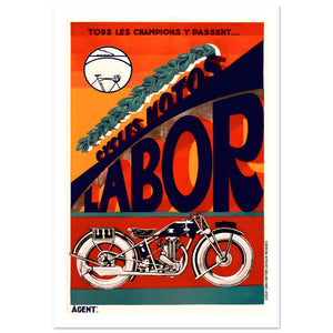 Embrace the golden age of French cycling and motorcycling with this striking vintage advertising poster for "CYCLES MOTOS LABOR." This Art Deco masterpiece features a bold, stylized "LABOR" text in dark blue against a vibrant orange background, with a detailed illustration of a classic motorcycle below. A green laurel wreath, symbolizing victory, and a circular bicycle logo complete the dynamic composition. Printed with rich, authentic colors, this poster is a perfect decorative piece for any garage, man cave, or vintage enthusiast's collection, capturing the spirit of speed and champion performance.