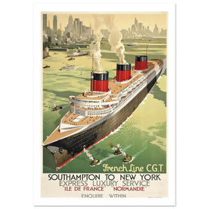 Step back into the Golden Age of Travel with this magnificent reproduction of a classic 1930s French Line poster. This striking piece of Art Deco history captures the grandeur of the legendary SS Normandie as she makes her "Express Luxury Service" run from Southampton to New York.