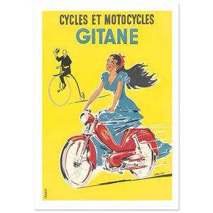 Infuse your home with mid-century French flair with this vibrant Gitane poster. The playful illustration features a woman in a flowing blue dress joyfully riding a red moped, while a gentleman on a penny-farthing bicycle tips his hat in the background. Set against a sunshine yellow backdrop, the bold blue "Gitane" typography celebrates the iconic brand's heritage in cycles et motocyclettes. This nostalgic collectible is a perfect piece of retro wall art for enthusiasts of French design and classic two-wheelers.