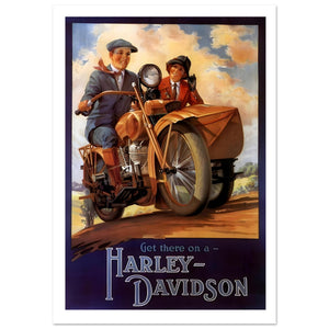 Relive the adventurous spirit of early American motorcycling with this vintage Harley-Davidson advertisement. The nostalgic artwork features a dapper gentleman and a stylish woman riding a classic v-twin motorcycle with a sidecar against a beautiful sunset. Emblazoned with the iconic slogan "Get there on a Harley-Davidson," this vibrant print captures the freedom and romance of the open road. It is a must-have collectible for enthusiasts of antique motorcycles and timeless automotive history decor.