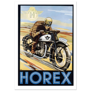 This captivating vintage poster promotes the Horex motorcycle, showcasing a rider in full gear speeding across a dynamic landscape. The motorcycle, with its sleek white design, stands out as a symbol of speed and precision. The rider, dressed in brown leather and sporting a helmet and goggles, embodies the spirit of adventure and daring. The bold "HOREX" logo at the bottom anchors the design, while the crown and winged "H" emblem above further highlight the brand's heritage and quality. The motion blur effect in the background emphasizes the thrill of the ride, making this poster a striking tribute to the Horex brand.
