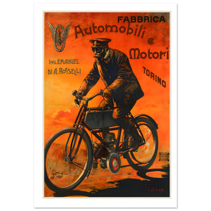 This breathtaking vintage Italian poster celebrates the pioneering engineering of Fabbrica Automobili e Motori by Ing. Emanuel di A. Rosselli. Against a dramatic, fiery orange sunset, a uniformed rider with classic goggles maneuvers an early motorized bicycle. The artwork’s rich textures and bold Torino typography capture the industrial prestige of Italian automotive history. A stunning example of early 20th-century advertising art, this print is a magnificent statement piece for collectors of retro motorcycles and classic European design.