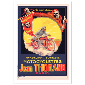 This striking vintage poster for Jean Thomann Motocyclettes features a surreal and dynamic composition. A racer on a red motorcycle speeds through a cloud of dust, framed by a luminous yellow sun. Looming behind is a large, vibrant orangutan, the brand’s unique mascot, holding a triangular banner that displays the company's 1920 founding date in Paris. The poster emphasizes the qualities of "Force, Confort, Souplesse" (Strength, Comfort, Flexibility). With its bold colors and imaginative imagery, this artwork is a quintessential example of early 20th-century French industrial graphic design.
