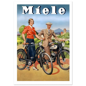 Vintage Miele Poster Featuring Classic Bicycle and Motorcycle