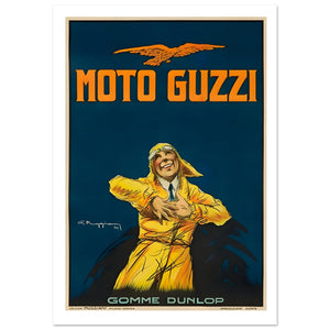 This classic Italian advertising poster for Moto Guzzi features a vibrant, joyful illustration of a rider clad in a bright yellow rain slicker and matching aviator cap. The rider’s expressive face and crossed hands convey a sense of pure delight and wind-swept freedom against a deep blue background. Above them, the iconic Moto Guzzi eagle spreads its wings in gold, paired with bold orange typography. The bottom of the poster highlights a partnership with Gomme Dunlop (Dunlop Tires). Produced by Edizioni Muggiani, this artwork captures the exuberant spirit and enduring legacy of Italian motorcycling history.