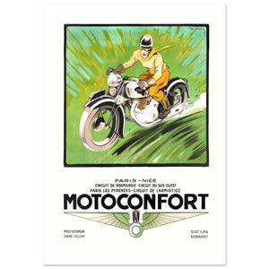 This dynamic vintage poster by acclaimed artist Geo Ham promotes Motoconfort motorcycles, highlighting the brand’s competition success in 1937. The central illustration captures a rider in a yellow suit leaning into a high-speed turn against a vibrant, streaked green background that emphasizes rapid motion. Below the artwork, the poster lists prestigious French racing achievements, including Paris-Nice and the Circuit de Normandie. The design features the winged Motoconfort logo and acknowledges technical partnerships with Hutchinson tires and Bernardet sidecars. It serves as a masterful example of mid-century French motorsport art, combining technical prestige with aesthetic energy.