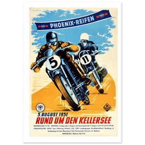This vintage poster, dating back to 1951, showcases a thrilling motorcycle race. Depicting two riders on their sleek bikes, numbered 5 and 11, the image is dynamic and full of energy, set against a bold, colorful backdrop of blue and orange. The event, "Rund um den Kellersee," took place on August 5, 1951, with details of training sessions and timings on the bottom. The Phoenix Reifen branding highlights its connection to the race, capturing the spirit of mid-century European motorsports and offering a glimpse into the racing culture of that era.