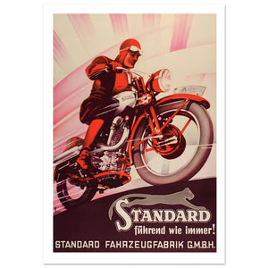 This striking vintage advertisement for Standard Fahrzeugfabrik captures the exhilarating essence of early 20th-century motorcycling. The poster features a rider in classic leather gear leaning into a high-speed turn, emphasized by dynamic motion lines and a bold, sunburst background.