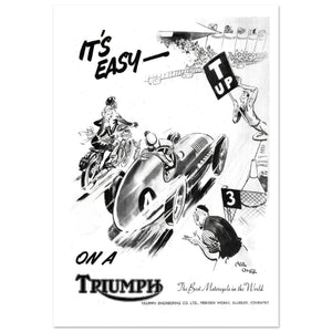 Bold slogans declare "IT'S EASY—ON A TRIUMPH," alongside the brand's famous claim, "The Best Motorcycle in the World". Signed by artist Alex Oxley, the dynamic sketch captures a lighthearted spirit of competition and British engineering pride from the Meriden Works in Coventry.