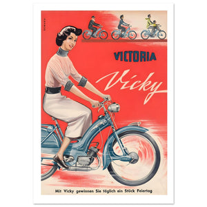 This vibrant vintage poster promotes the Victoria Vicky scooter, showcasing a young woman happily riding the stylish blue scooter. The bright red background highlights the bold "VICTORIA" and "Vicky" lettering, creating a striking visual contrast. The tagline, "Mit Vicky gewinnen Sie täglich ein Stück Feiertag" (With Vicky, you win a little holiday every day), evokes the joy and freedom of riding. The top section of the poster shows silhouettes of people enjoying their scooters, reinforcing the idea of everyday leisure and adventure. The overall design exudes retro charm, emphasizing the scooter’s practicality and fun.