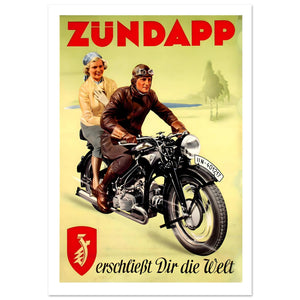 This classic Zündapp motorcycle advertisement captures a sense of adventure and freedom. A man in a vintage leather flight jacket and goggles rides the bike with a smiling woman seated behind him, dressed in a light-colored blouse and scarf. The bright red "ZÜNDAPP" logo stands out at the top, while the German phrase "erschließt Dir die Welt" translates to "Unlock the world for you." The background features a scenic, open landscape, emphasizing the motorcycle's ability to take riders anywhere. This vibrant and nostalgic poster showcases the spirit of exploration and the joy of motorcycle travel with Zündapp.