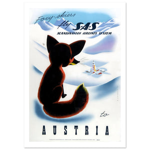 This charming vintage travel poster for Scandinavian Airlines System (SAS) invites "foxy-skiers" to visit Austria. The whimsical design features a stylized red fox sitting in the foreground, looking out over a pristine, snow-covered mountain landscape. In the distance, a small, picturesque alpine village with a church steeple is nestled among the soft white slopes. The poster’s minimalist aesthetic uses gentle blue and purple gradients to evoke a crisp winter atmosphere. With bold typography and the iconic SAS logo, the artwork playfully combines nature and sport to promote the allure of Austrian skiing.